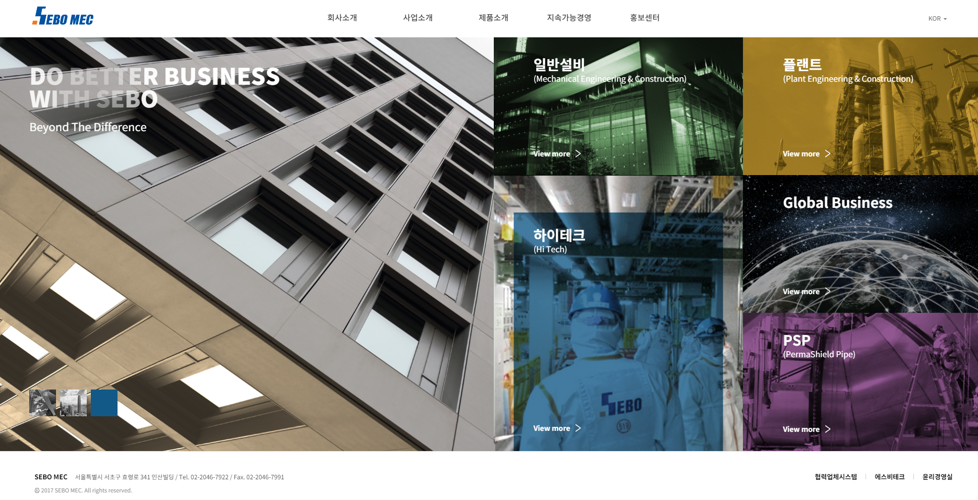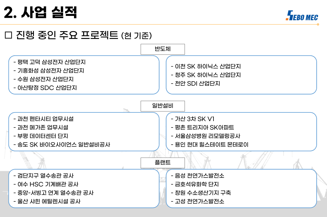 1978년 '세보기계공업주식회사'에서 시작한 세보엠이씨는 기본에 충실한 기업문화를 바탕으로 대한민국 성장의 한 축인 반도체, 제조분야 뿐만 아니라, 아파트, 오피스, 주상복합, 유통, 플랜트 분야 설비 공사에 성공적으로 참여하여 고객, 주주, 사회구성원들에게 대한민국 설비 건설업계 선두업체로써 기술력을 인정받고 있습니다.