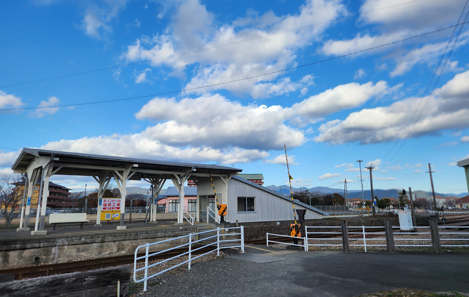 앞에 보이는 판자 건물이 역이에요.