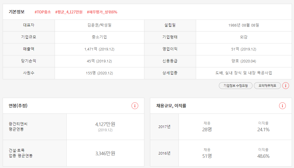 사람인에 나오는 광건티엔씨의 기본 정보입니다.