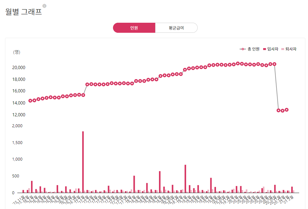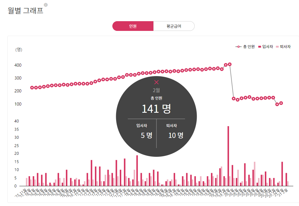 위 그래프는 미코의 월별 재직 인원 그래프이고,