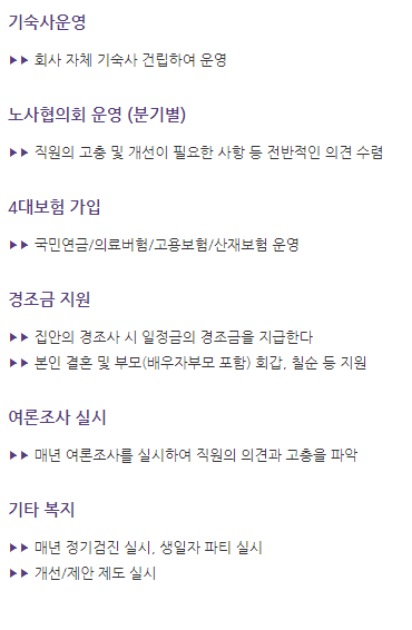 기숙사, 노사협의회, 4대보험, 경조금, 여론조사(?), 생일자 파티(?)